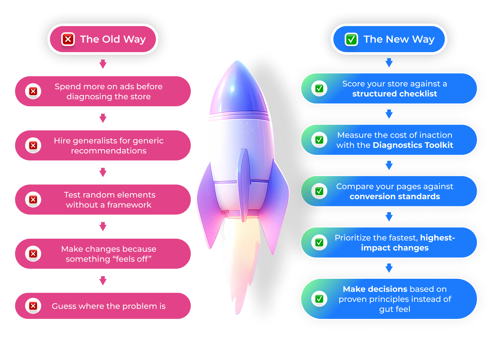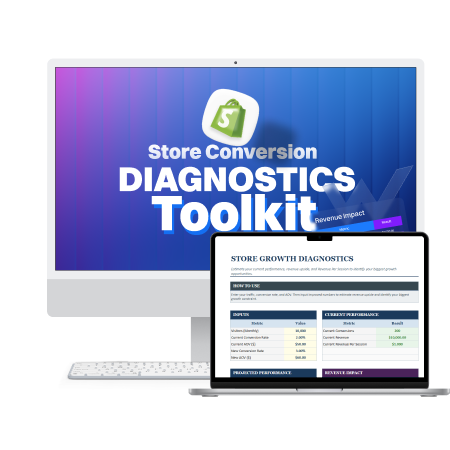 It is a professional-grade diagnostic toolkit containing 6 components: the 150+-point ConversionDesign™ Checklist, the Store Conversion Diagnostics Toolkit (a pre-built Google Sheet calculator), the ATID COA Page Frameworks, the 30 Quickest Conversion Rate Wins, the Top 10 Conversion Principles, and the 5 Ways To SKYROCKET Your Conversion Rates. Together, they give you everything you need to find exactly what is wrong with your store, quantify what it is costing you in real dollars, and know what to fix first.
