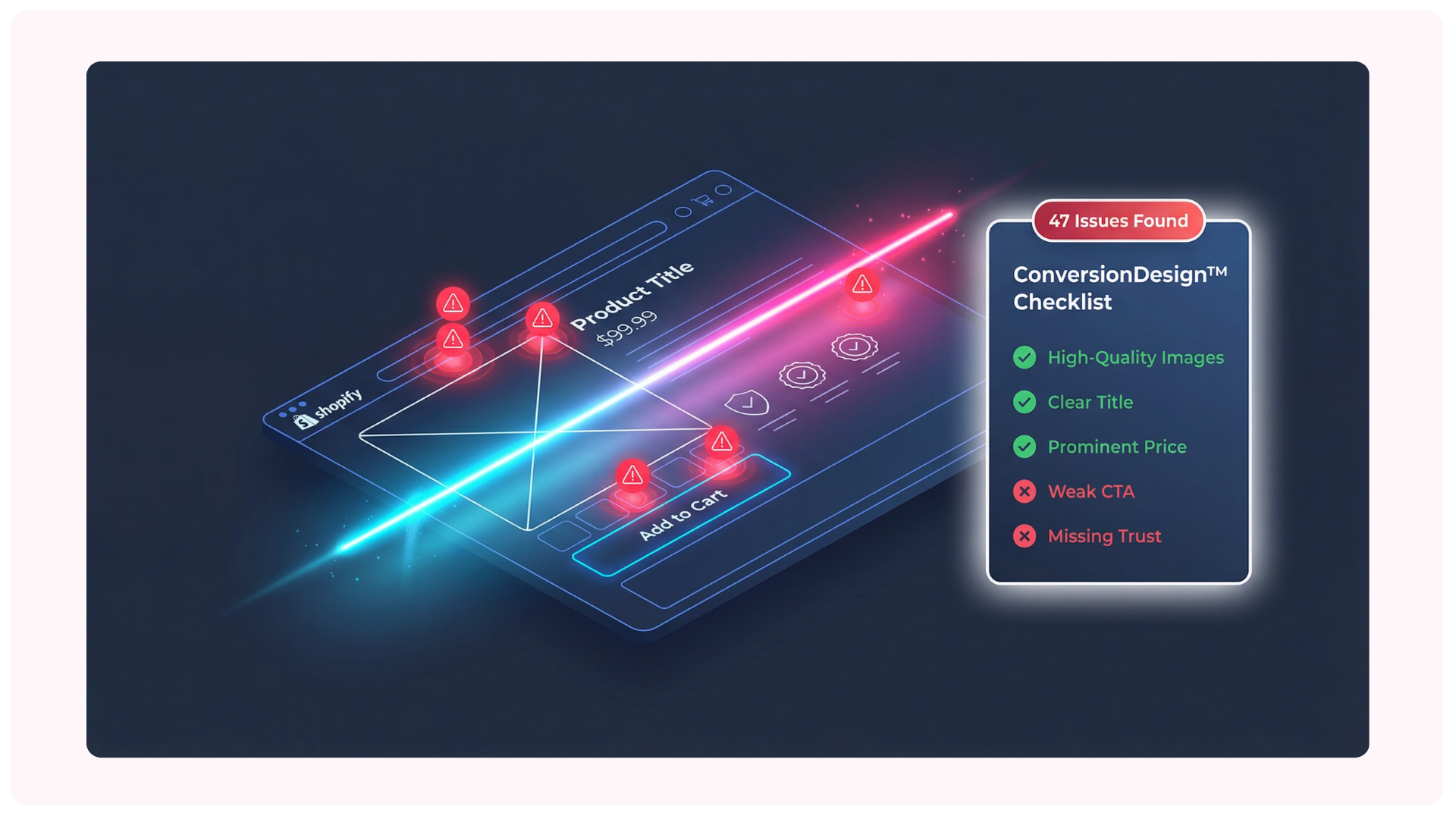 When we ran the ConversionDesign™ Checklist, we found 47 specific issues across product pages, cart, and checkout.